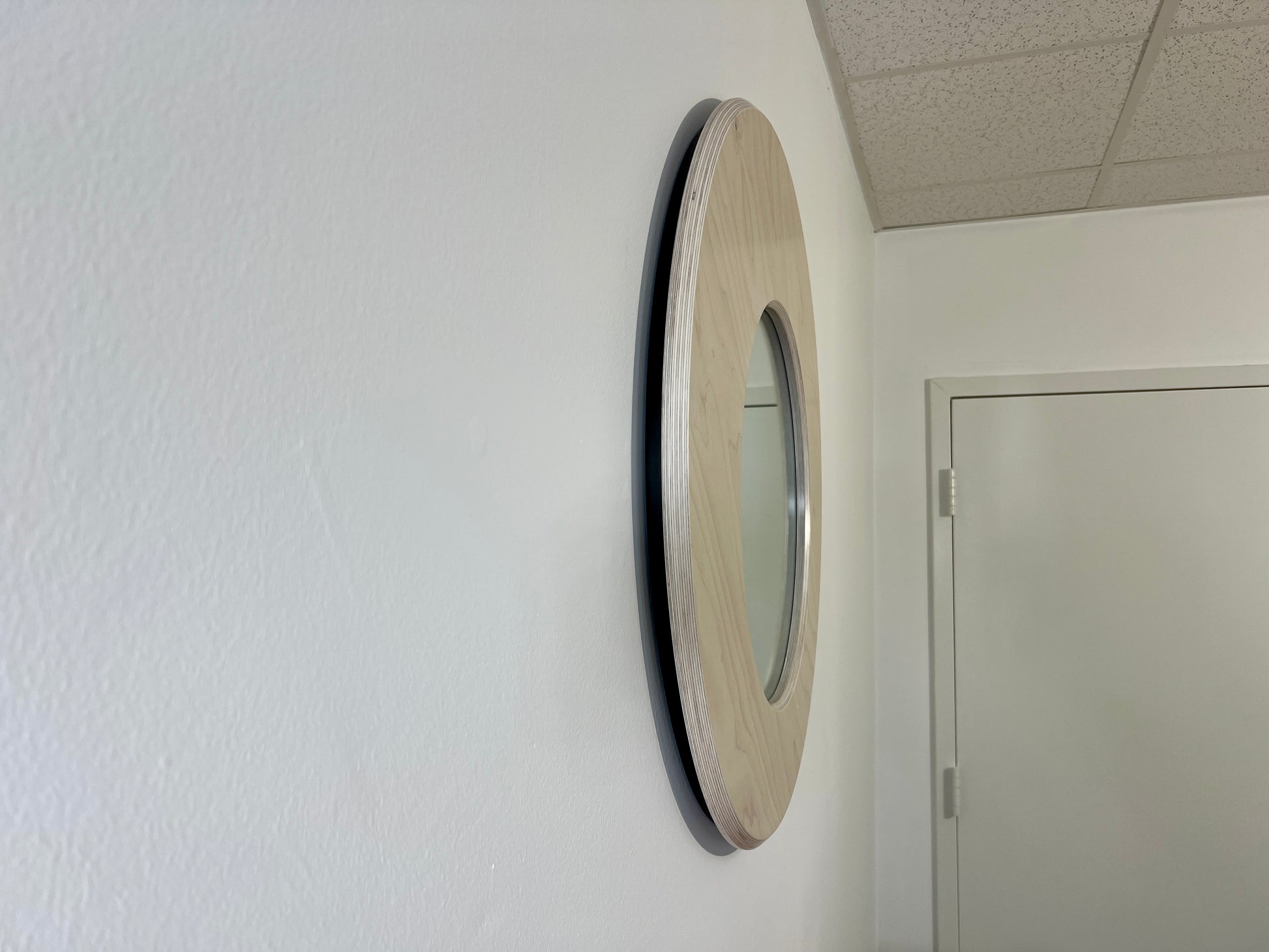 An asymmetrical round wall mirror framed in beveled Baltic birch. The form is clean and modern, offering subtle imbalance without visual noise.