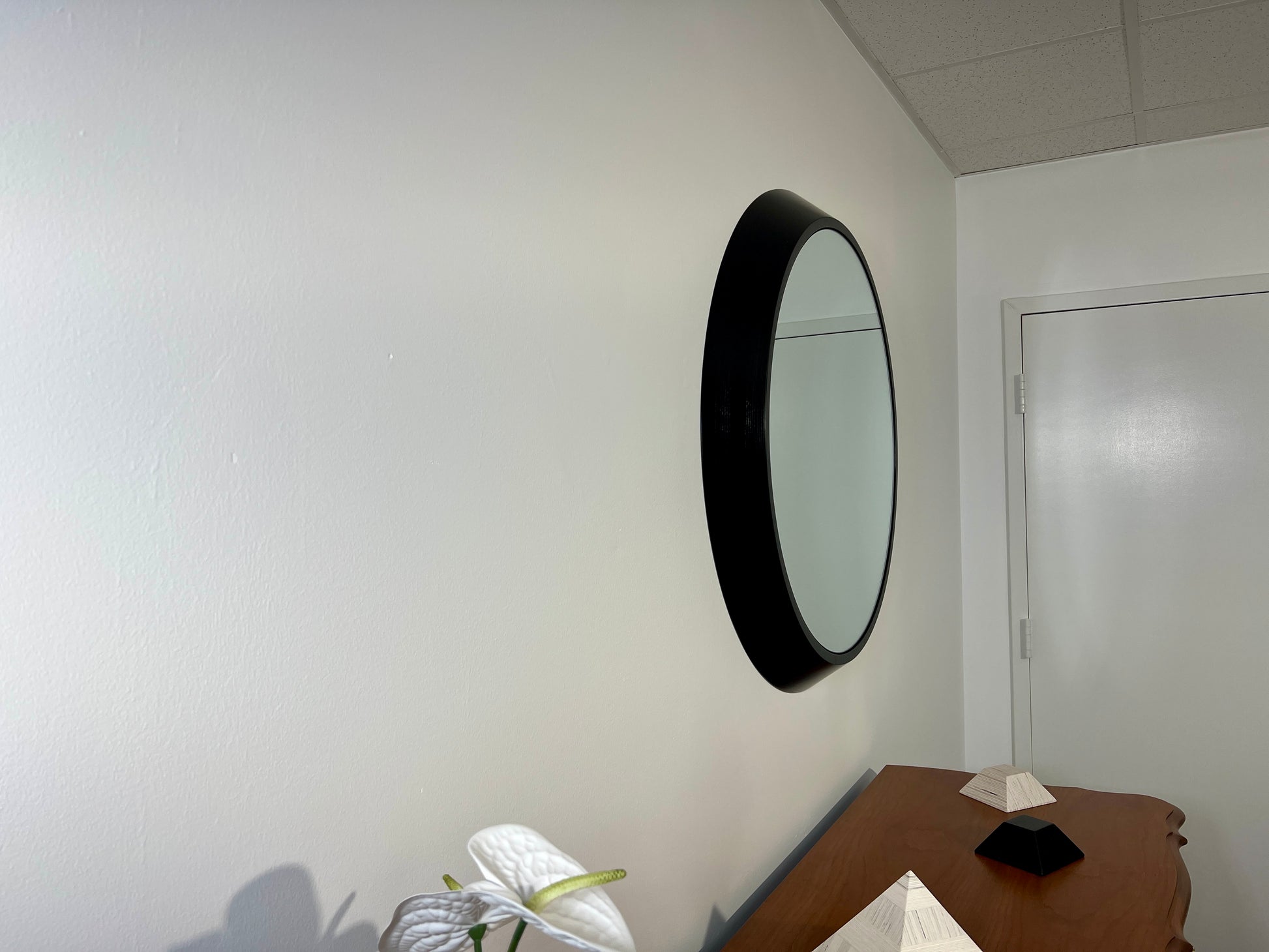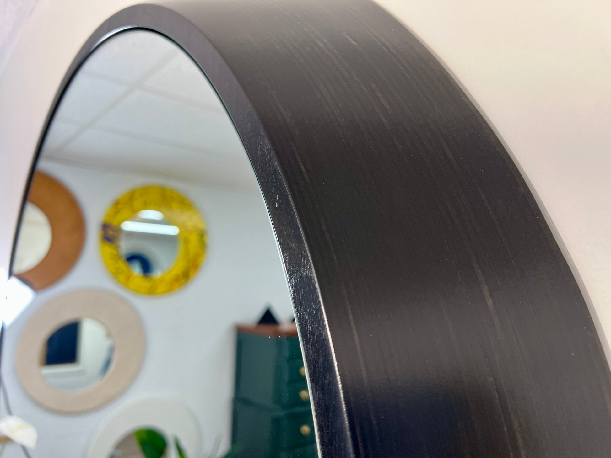 A round wall mirror with a deep 45° beveled frame that projects roughly 3.5″ from the wall, creating a quiet sculptural presence. Finished in black stain with a satin lacquer finish, the surface reads uniform and grounded. Light lifts along the angled perimeter, emphasizing its dimensional form.