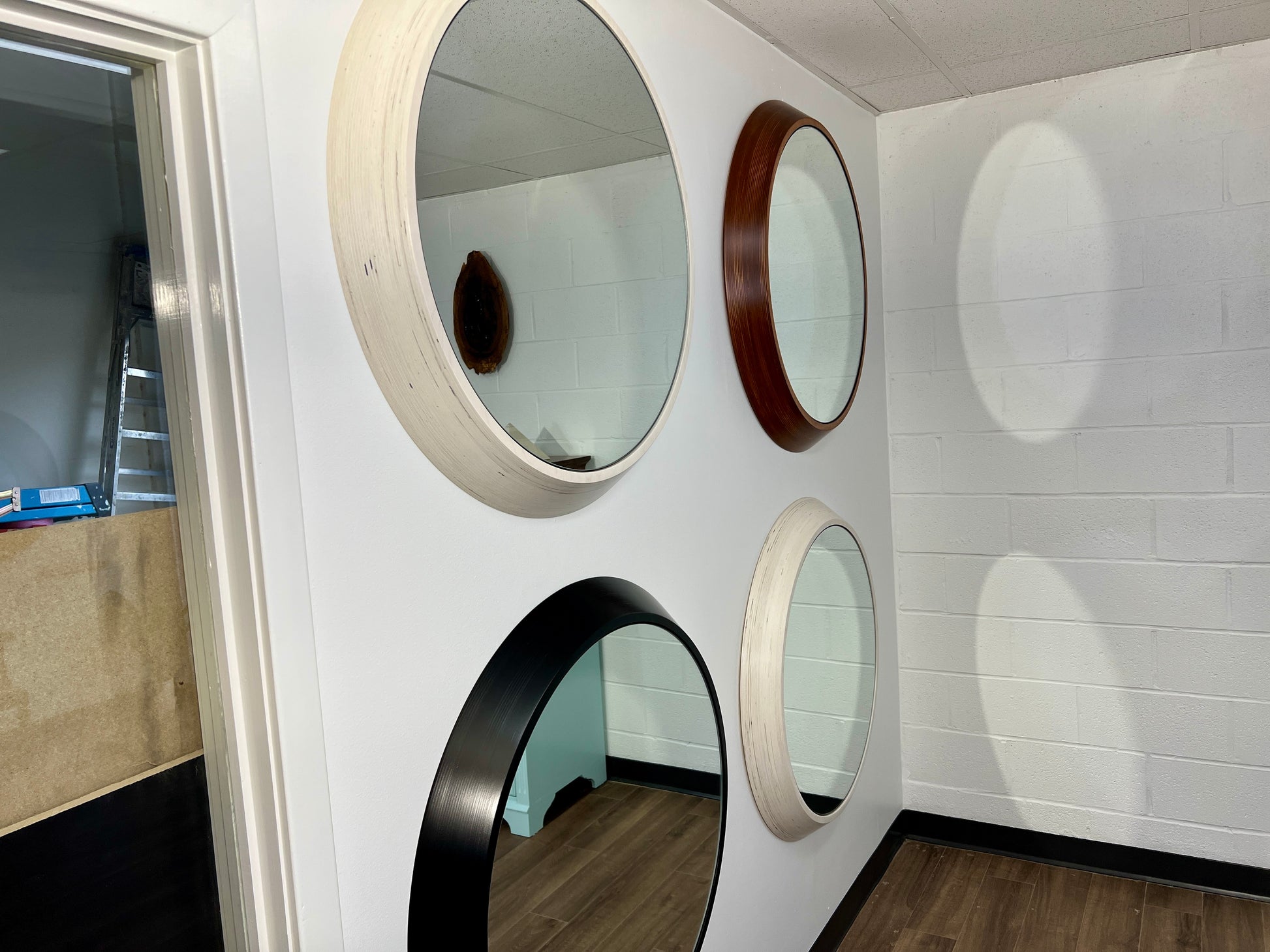 A round wall mirror with a deep 45° beveled frame that projects roughly 3.5″ from the wall, creating a quiet sculptural presence. Finished in white stain with a satin lacquer finish, the surface feels crisp and neutral. Light lifts along the angled perimeter, emphasizing its dimensional form.