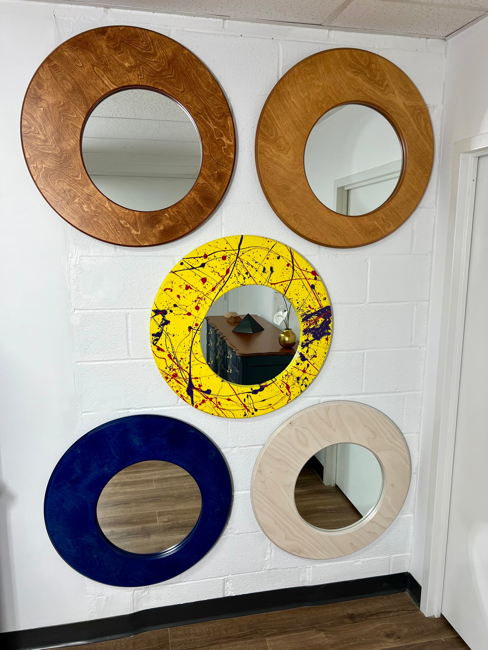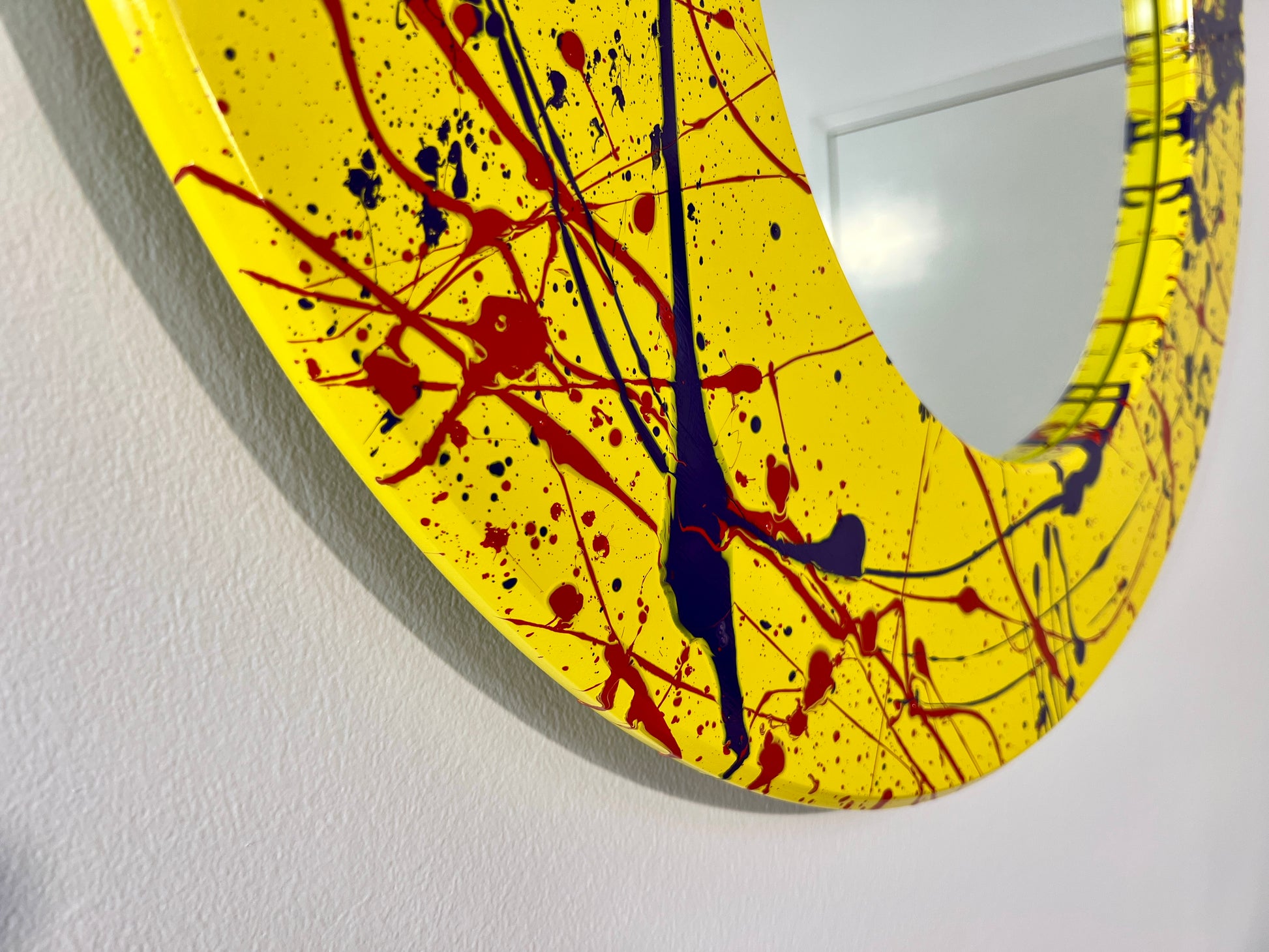 Finished in yellow acrylic with red and violet drip accents, the piece carries an energetic, gestural quality. Color moves across the frame in controlled layers, allowing the drips to introduce rhythm and direction without overwhelming the silhouette. A crisp outer bevel catches light, while a softer inner bevel outlines the mirror and adds quiet dimension.